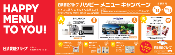 日清製粉グループは、1月から展開している「ハッピーメニュー Project」の今年度最大のコミュニケーション施策として、今夏、「日清製粉グループ ハッピーメニューキャンペーン」を実施する。消費者プレゼントを中心に、TVCMの投入や主要都市での交通広告、テレビ局とのタイアップ企画等の施策を全国規模で順次展開する。消費者プレゼントは、バルミューダ(BALMUDA)製品や同社グループオリジナルキャラクター「コニャラ」のグッズなどが総計5000名に当たるオープン懸賞として実施する。
