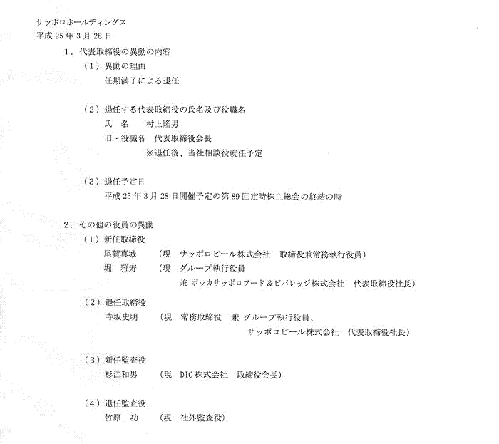 - サッポロホールディングス、サッポロビール<役員陣容>(3月30日)