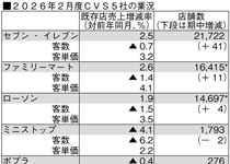 CVS5社2026年2月度販売実績 既存店売上大手3社プラス